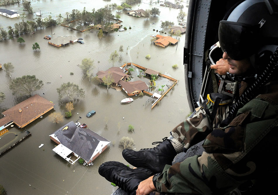 An Air Force Reserve pararescueman assigned to the 331st Air Expeditionary Group scans the ravaged Texas landscape for signs of life in the aftermath of Hurricane Ike. Deployed from the 920th Rescue Wing at Patrick Air Force Base, Fla., the pararescuemen, along with aircrews, two HH-60G Pave Hawk helicopters and two HC-130P/N refueling aircraft, rescued 17 people from the small Texas town of Nederland Sept. 13. (U.S. Air Force photo/Tech. Sgt. Paul Flipse)