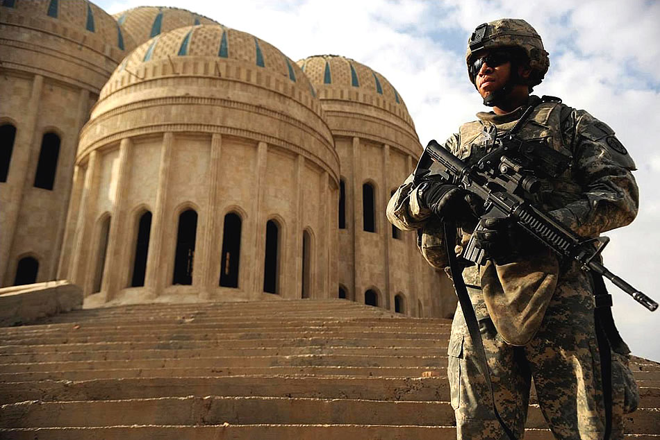 U.S. Army Spc. Michael McMiller provides security prior to linking up with an Iraqi army unit at the Saddam Mosque to conduct a joint operation patrol in Al Zarai, Iraq, Oct. 30, 2008. The soldiers are assigned to the 3rd Armored Cavalry Regiment's 3rd Squadron. U.S. Air Force Staff Sgt. JoAnn S. Makinano