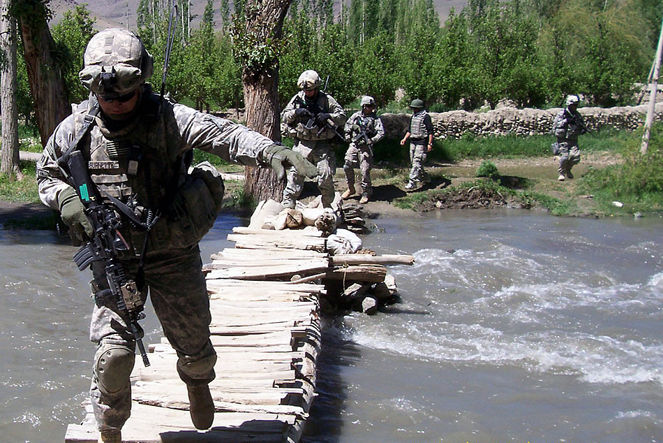 Soldiers from Battery B, 4-25 Field Artillery, navigate across a creek during a dismounted patrol in Nerkh Valley, Afghanistan, June 4. The artillerymen begin maneuver operations in Wardak province. Photo by Rob Frazier