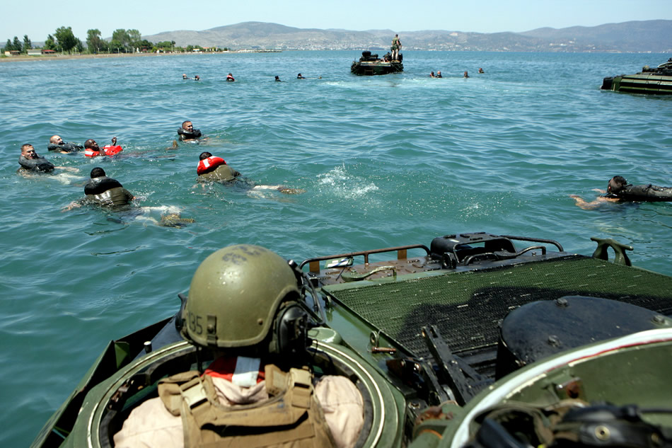 U.S. Marines swim to shore after jumping from an amphibious assault vehicle during surf qualification training off the coast of Greece, June 6, 2009. the Marines are assigned to the 22nd Marine Expeditionary Unit, which is on a 12-day training mission in Greece. U.S. Marine Corps photo by Cpl. Theodore W. Ritchie