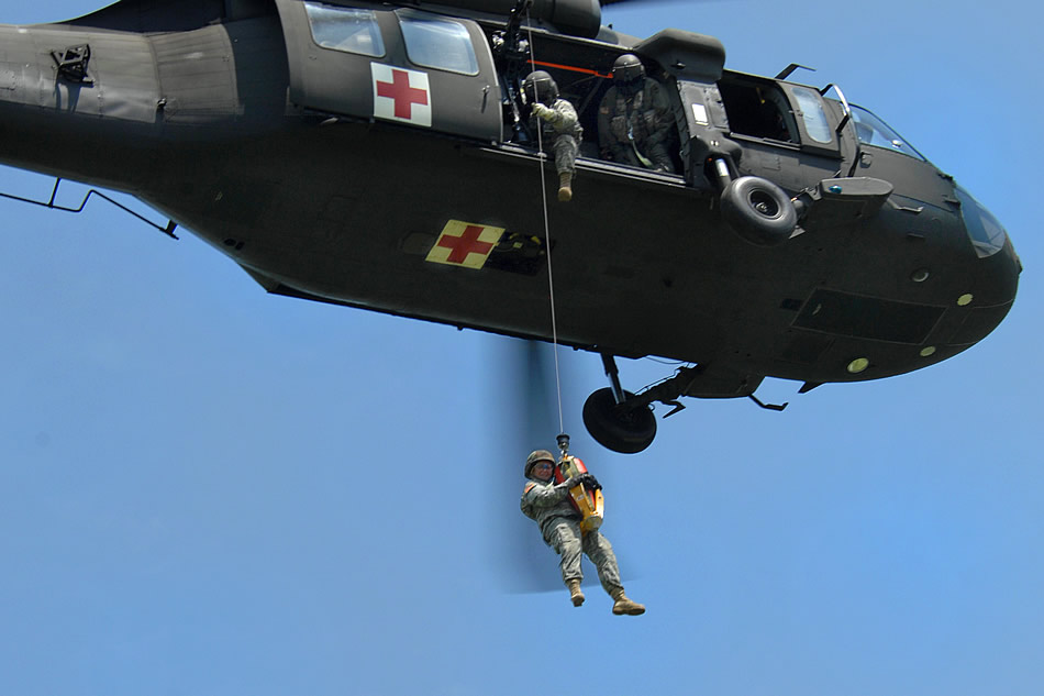 U.S. Army Pfc. Amanda Gust is hoisted to a UH-60 Black Hawk helicopter for a simulated patient extraction drill during Exercise Global Medic 2009, on Bush Field, Ga., June 15, 2009. Gust is a combat medic assigned to the 548th Minimal Care Detachment, which is participating in teh annual U.S. Army-Air Force medical readiness exercise. U.S. Air Force photo by Senior Airman Erica J. Knight