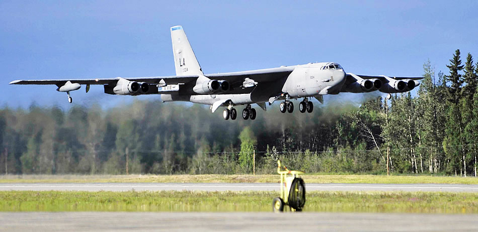 A B-52H Stratofortress takes off from Eielson Air Force Base, Alaska, June 23 during Northern Edge 2009. The exercise is one in a series of U.S. Pacific Command exercises that prepare joint forces to respond to crises in the region. The B-52 is assigned to Barksdale AFB, La. (U.S. Air Force photo/Staff Sgt. Christopher Boitz)