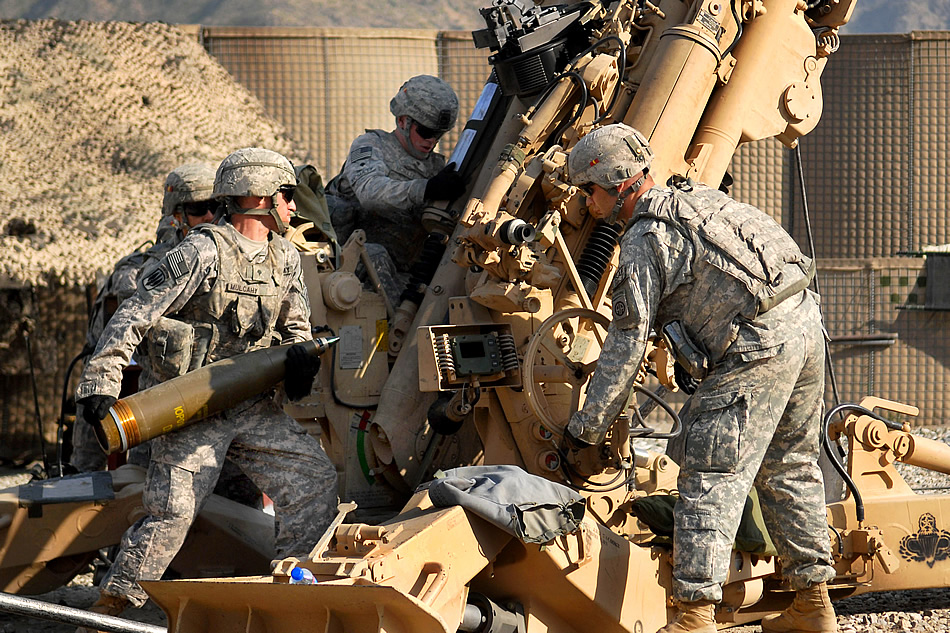 U.S. Army Spc. Seth Mulcahy, left, along with Spc. Robert Mason, right, and Spc. Richard McNulty, center, load a 155 mm howitzer on Camp Wright, Afghanistan, Sept. 23, 2009. Mulcahy, Mason and McNulty are assigned to Battery C, 1st Battalion, 321 Airborne Field Artillery Regiment. The team fired the weapon as part of a registry exercise where targets are pre-marked to increase speed and accuracy. U.S. Air Force photo by Tech. Sgt. Brian Boisvert