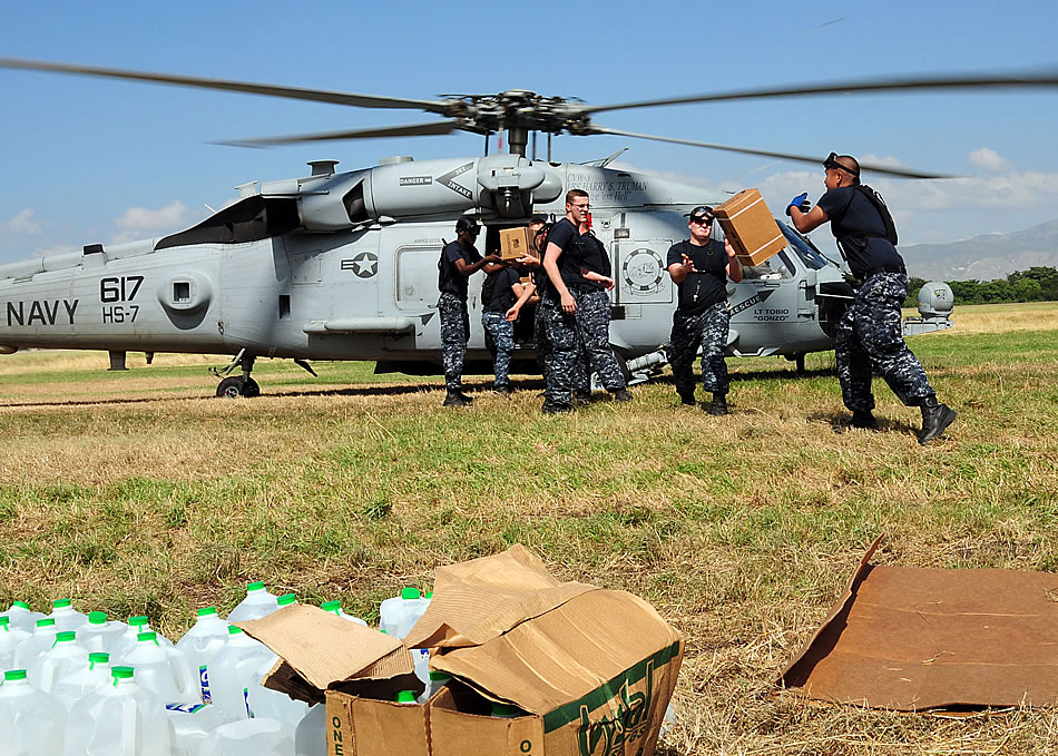 PORT-AU-PRINCE, Haiti (Jan. 17, 2010) Sailors attached to the aircraft carrier USS Carl Vinson (CVN 70) load water and boxes of meals ready-to-eat (MREs) onto a SH-60S Sea Hawk helicopter of Helicopter Anti-submarine Squadron (HS) 7. These supplies will be distributed to earthquake survivors. Carl Vinson and Carrier Air Wing 17 are conducting humanitarian and disaster relief operations as part of Operation Unified Response after a 7.0 magnitude earthquake struck Haiti, Jan. 12. (U.S. Navy photo by Mass Communication Specialist 2nd Class Candice Villarreal)