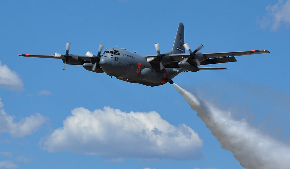 An Air Force Reserve C-130 Hercules expels water during a capabilities demonstration over Peterson Air Force Base, Colo., April 23, 2012, as part of an annual Modular Airborne Fire Fighting System II certification exercise. The U.S. Forest Service-led training, hosted by the 302nd Airlift Wing, certified aerial firefighting C-130 crews to perform the MAFFS mission. The 302nd AW is the only Air Force Reserve unit with MAFFS capabilities. (U.S. Air Force photo/Tech. Sgt. Daniel Butterfield)