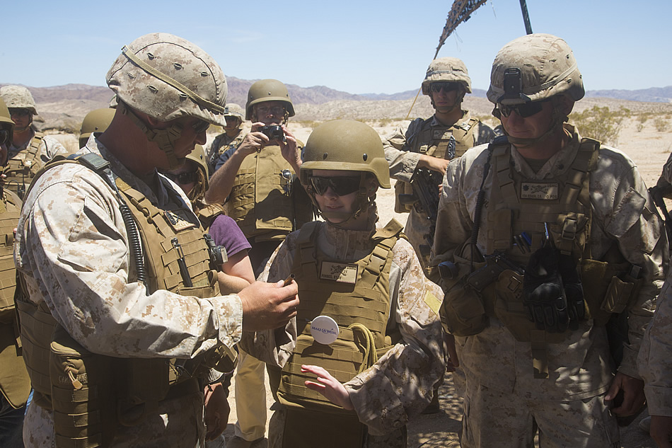 U.S. Marine Master Sgt. Dean Beutz (left) with Lima Battery, 3d Battalion, 11th Marine Regiment, 1st Marine Division, gives Ryan Forbes (center), a 13-year-old San Diego native diagnosed with Medulloblastoma, a form of brain cancer, an empty primer casing from an M-777 Lightweight 155mm howitzer during a Make-A-Wish Foundation event aboard Marine Corps Air Ground Combat Center (MCAGCC) in Twentynine Palms, Calif., May 13, 2014. Make-A-Wish Foundation partnered with 11th Marine Regiment to help Forbes fulfill his wish to become a Marine for a day. (U.S. Marine Corps photo by Cpl. Ismael Ortega, 1st Marine Division Combat Camera)