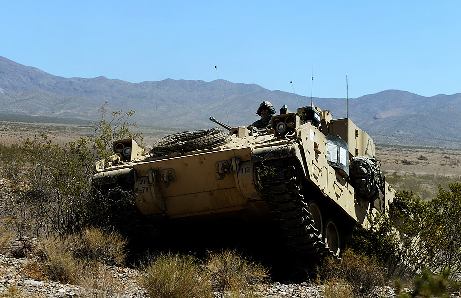 U.S. Army Soldiers, from the 1st Armored Brigade Combat Team, 3rd Infantry Division, maneuver a Bradley Fighting Vehicle through the training area during Decisive Action Rotation 14-09 at the National Training Center here, Aug. 9, 2014. Decisive action rotations are reflective of the complexities of potential adversaries our nation could face and include: guerrilla, insurgent, criminal and near-peer conventional forces woven into one dynamic environment. (U.S. Air Force photo by Senior Airman Daniel Hughes, 1st Combat Camera Squadron)