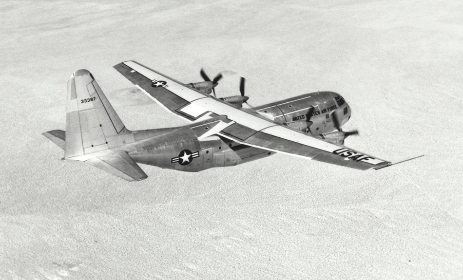 Archived photo of the YC-130 Hercules during its ferry flight from Burbank, Calif. to Edwards Air Force Base, Calif. August 23, 1954. The C-130 is still in production today, making it the longest running military aircraft production line in history. (U.S. Air Force photo)