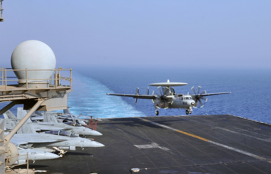 ARABIAN GULF (Aug. 21, 2014) An E-2C Hawkeye attached to the Bear Aces of Carrier Airborne Early Warning Squadron (VAW) 124 lands on the flight deck of the aircraft carrier USS George H.W. Bush (CVN 77). George H.W. Bush is supporting maritime security operations and theater security cooperation efforts in the U.S. 5th Fleet area of responsibility. (U.S. Navy photo by Mass Communication Specialist 3rd Class Margaret Keith)