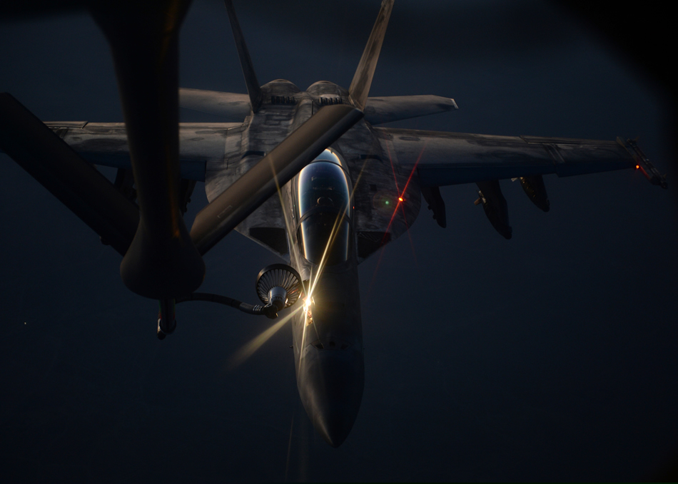 A U.S. Air Force KC-135 Stratotanker aircraft refuels a Navy F/A-18F Super Hornet aircraft assigned to Strike Fighter Squadron (VFA) 213 over Iraq Aug. 21, 2014. President Barack Obama authorized humanitarian aid deliveries to Iraq as well as targeted airstrikes to protect U.S. personnel from extremists known as the Islamic State in Iraq and the Levant. U.S. Central Command directed the operations. (DoD photo by Staff Sgt. Shawn Nickel, U.S. Air Force)