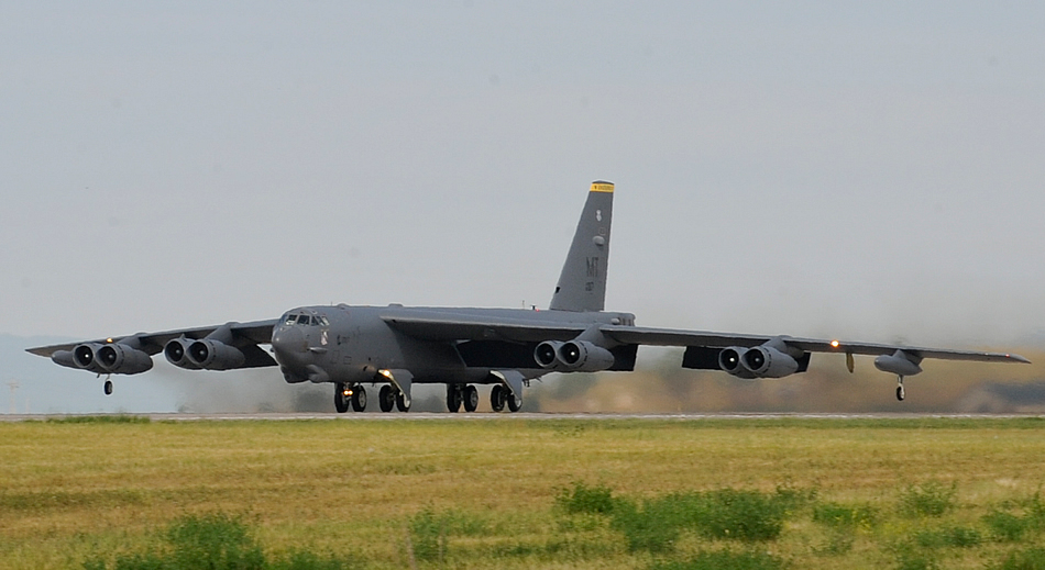A B-52 Stratofortress takes off Aug. 14, 2014, during a standoff weapons integration training exercise at Ellsworth Air Force Base, S.D. The week-long training consisted of B-52s and B-1B Lancers conducting simulated combat scenarios at the Powder River Training Complex, S.D. to help prepare for real-world contingencies. The B-52 is from Minot Air Force Base, N.D. (U.S. Air Force photo/Senior Airman Anania Tekurio)