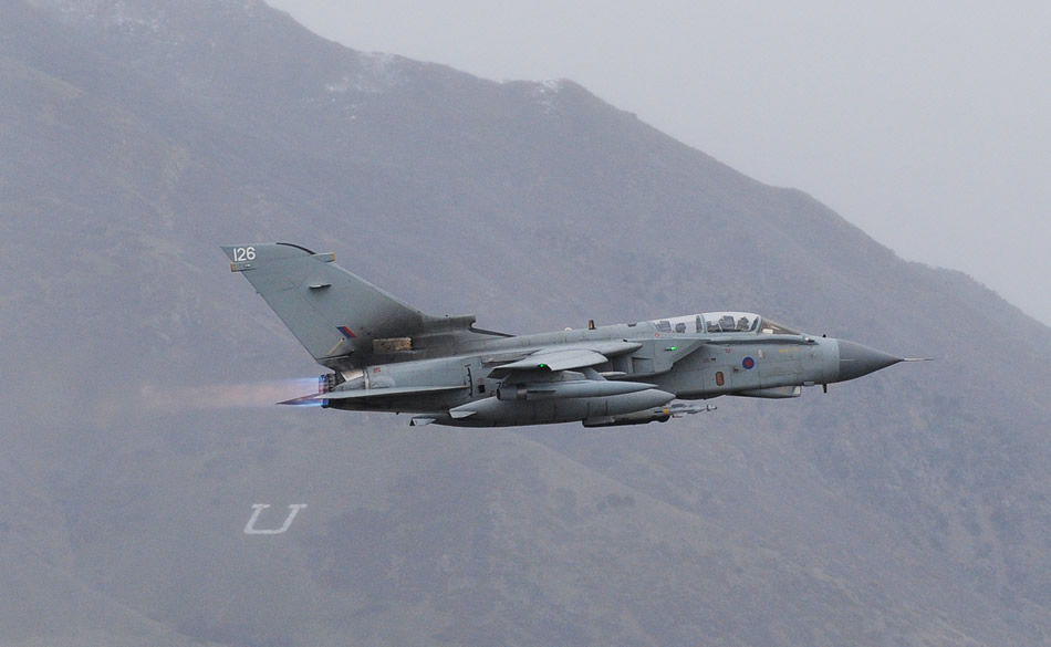 3/21/2014 - A Tornado GR4 departs Hill Air Force Base for a training mission March 6. A Royal Air Force Tornado Training Squadron from RAF Lossiemouth in Northern Scotland was detached to Hill AFB for three weeks and utilized the Utah Test and Training Range to drop a variety of weapons. The Tornado is a twin seat, all-weather, advanced low-level strike platform and is in its thirty-first year of operational service with the RAF. (U.S. Air Force photo by Alex R. Lloyd)