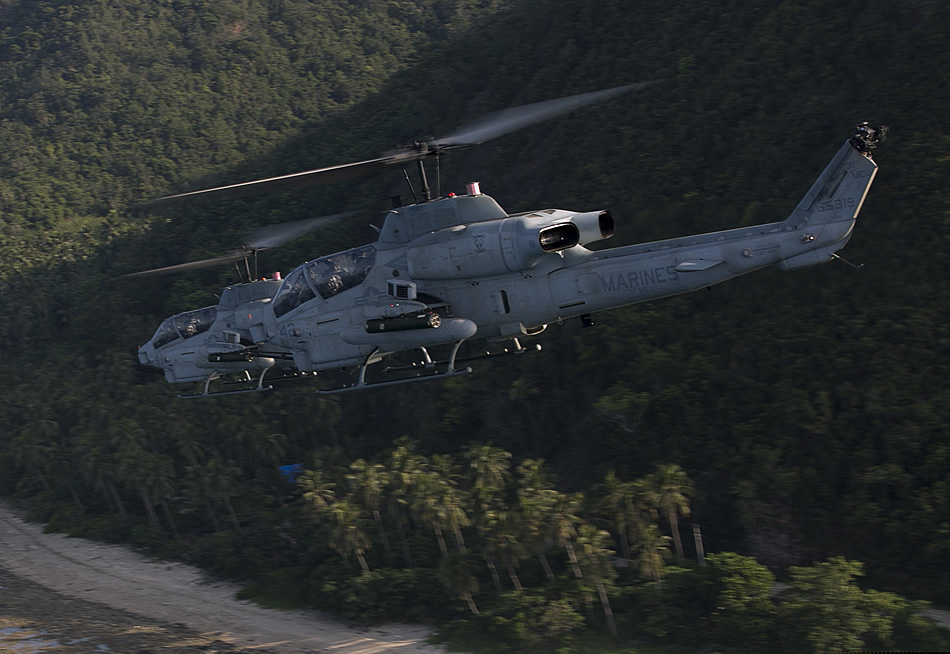 Two U.S. Marine Corps AH-1W Super Cobra helicopters assigned to Marine Medium Tiltrotor Squadron (VMM) 262 (Reinforced), 31st Marine Expeditionary Unit fly in a tight formation over Clark Air Base, Pampanga province, Philippines, Sept. 30, 2014, during Amphibious Landing Exercise (PHIBLEX) 15. PHIBLEX is a bilateral training exercise designed to improve the interoperability, readiness and professional relationships between the U.S. Marine Corps and partner nations. (DoD photo by Lance Cpl. Robert Williams Jr., U.S. Marine Corps )