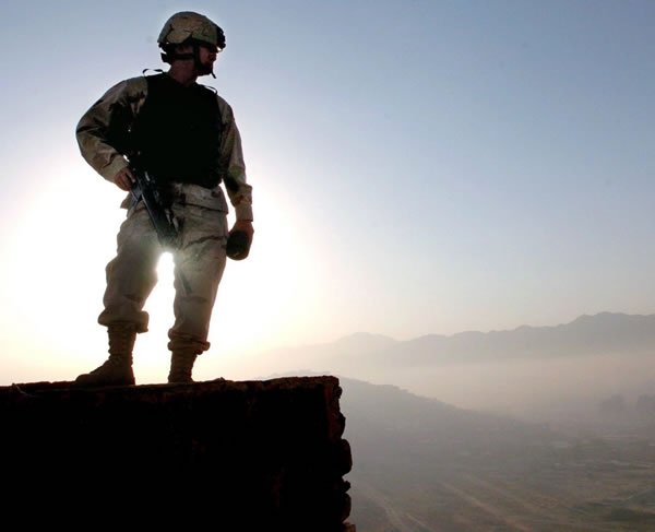 October 4, 2005As the sun rises, Sgt. Phillip Chang, from the Alaska Army National Guard, patrols the outskirts of Kabul, Afghanistan. Photo by Sgt. Benjamin T. Donde