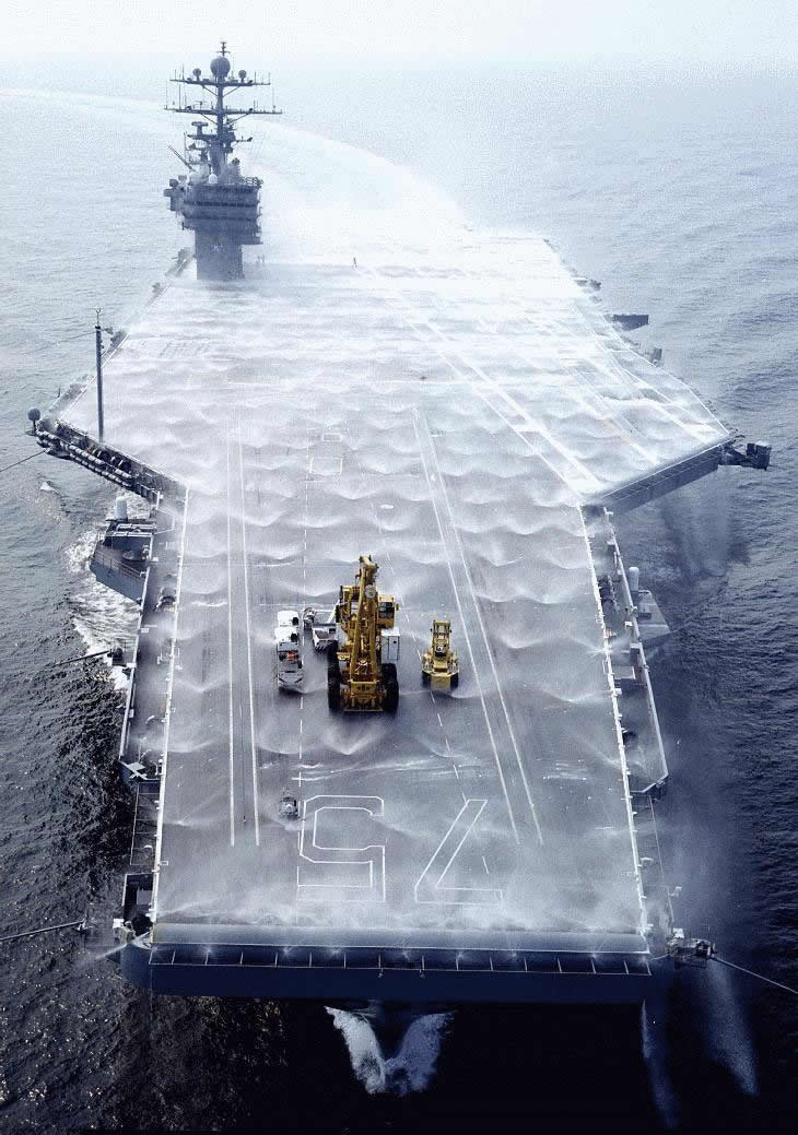 Test of a saltwater washdown system for Chemical/Biological/Radiological attacks. The system doubles as a fire suppression system.