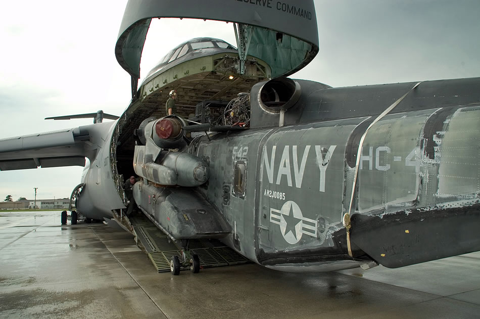 Cherry Point, N.C. (Aug. 8, 2005) - U.S. Marines assigned to Marine Aircraft Group Sixteen (MAG-16), off-load a Navy MH-53 Sea Dragon helicopter from an Air Force C-5 Galaxy transport on board Marine Corps Air Station Cherry Point. Three MH-53 Sea Dragons have been removed from the nation's war reserve, or "bone yard," at Davis-Monthan Air Force Base, Ariz., for upgrading and reconfiguration at Naval Air Depot Cherry Point, before being returned for service in the fleet. Photo courtesy of Larry Conley