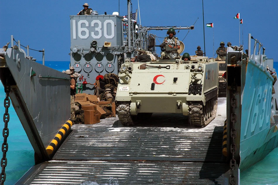 Mubarek Military City, Egypt (Sept. 12, 2005) � A Landing Craft utility (LCU) assigned to Assault Craft Unit One (ACU-1) embarked aboard amphibious assault ship USS Tarawa (LHA 1) offloads an Egyptian armored personnel carrier on the coast of Eygpt during multi-national Exercise Bright Star 2005. The exercise is an important part of U.S. Central Command�s theater engagement strategy and is designed to improve readiness, interoperability, strengthen the military and professional relationships among U.S., Egyptian and participating forces. The multinational exercise is held every two years. U.S. Navy photo by Journalist 1st Class Kurt P. Wesseling.