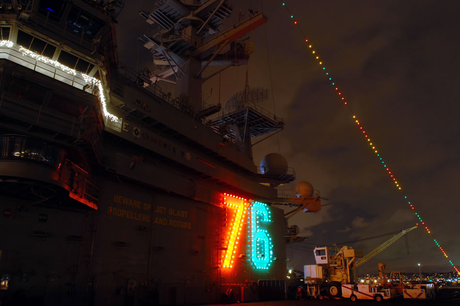 CORONADO, Calif. (Dec. 18, 2007) While moored at Naval Air Station North Island, the Navy's newest Nimitz-class nuclear-powered aircraft carrier USS Ronald Reagan (CVN 76) displays its holiday lights during Christmas and New Year celebrations in port. U.S. Navy photo by Mass Communication Specialist 2nd Class Joseph M. Buliavac
