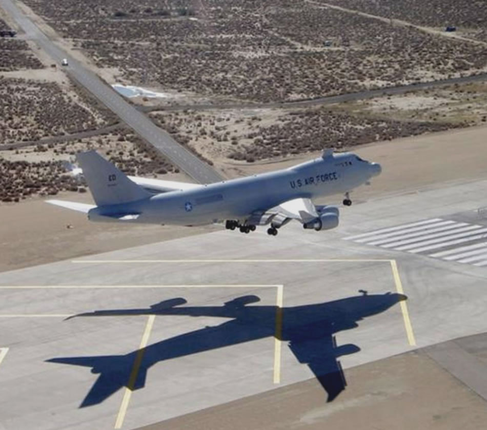 YAL-1A, a modified Boeing 747-400F known as the Airborne Laser, lands on Runway 22 Jan. 19 at Edwards Air Force Base, Calif. It's undergoing a long-term test phase that includes the test firing of the aircraft's low-power lasers in flight for the first time.
