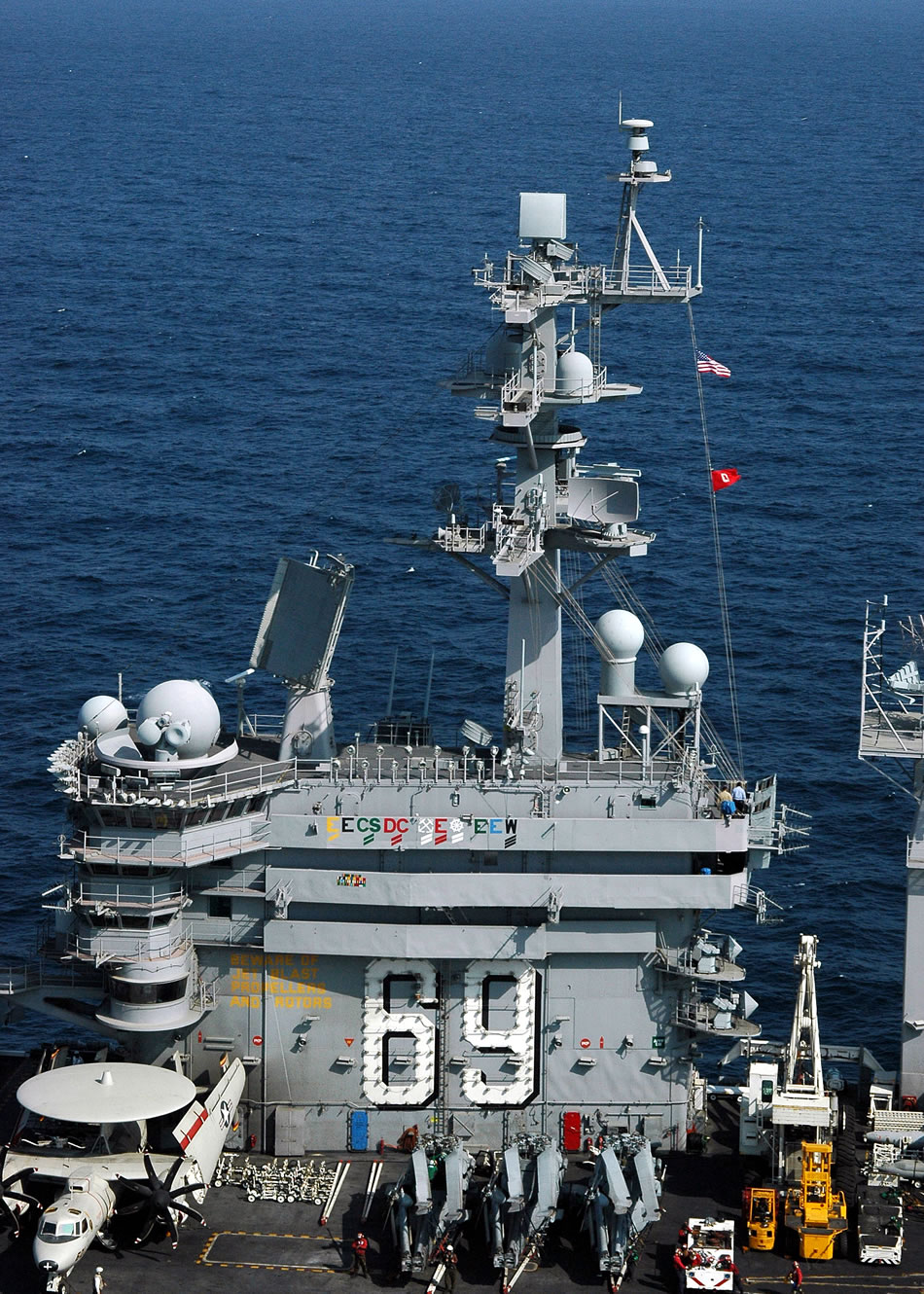 Arabian Sea (Jan. 3, 2007) - The Ohio State University Buckeyes flag is flown aboard the Nimitz-class aircraft carrier USS Dwight D. Eisenhower (CVN 69) as a show of support by Eisenhower fans for the Bowl Championship Series Championship game against the of the University of Florida Gators. Eisenhower and embarked Carrier Air Wing Seven (CVW-7) are on a regularly scheduled deployment operating in support of Maritime Security Operations. U.S. Navy photo by Mass Communication Specialist 2nd Class Miguel Angel Contreras