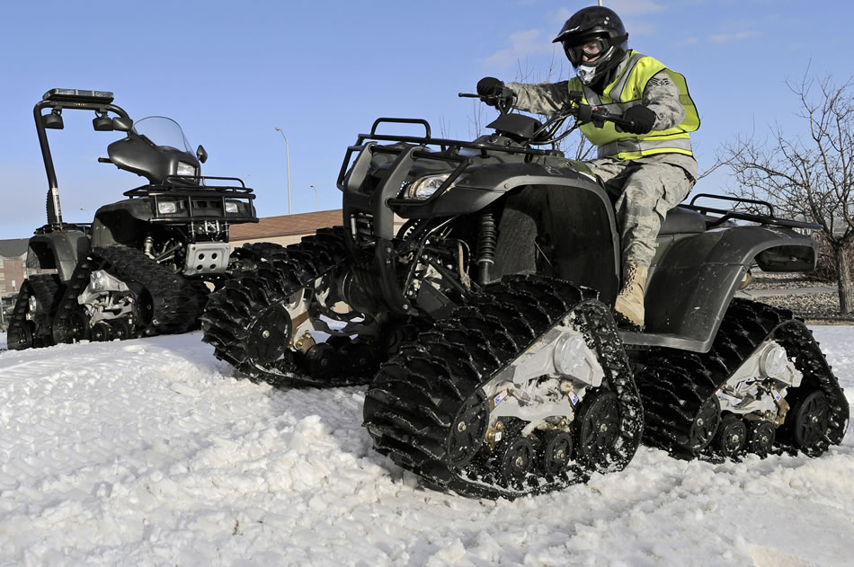 Staff Sgt. John Cooke tests the maneuverability of an all-terrain vehicle equipped with a rubber track conversion system Jan. 6 at Ellsworth Air Force Base, S.D. The rubber tracks should improve snow rescue capabilities. He is with the 28th Security Forces Squadron. (U.S. Air Force photo/Senior Airman Marc I. Lane)