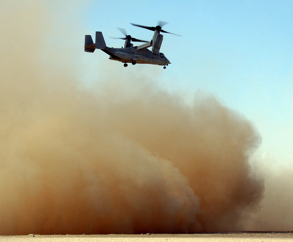 An MV-22B Osprey assigned to Marine Medium Tiltrotor Squadron 263 (Reinforced) from the 22nd Marine Expeditionary Unit, land at a bivouac site during Exercise Bright Star 2009 in Egypt. Bright Star is a biennial, multinational exercise designed to improve readiness, interoperability, and strengthen the military and professional relationships among U.S., Egyptian and participating forces. Bright Star is conducted by U.S. Central Command. Photo by Cpl. Theodore Ritchie