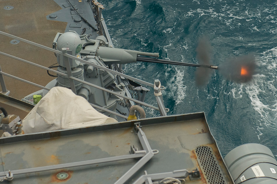 ATLANTIC OCEAN (Jan. 16, 2014) The Arleigh Burke-class guided-missile destroyer USS Donald Cook (DDG 75) fires a computer-controlled MK-38 machine gun during a weapons exercise. Donald Cook is underway in preparation for a homeport shift to Rota, Spain. (U.S. Navy photo by Mass Communication Specialist Seaman Adam Austin)