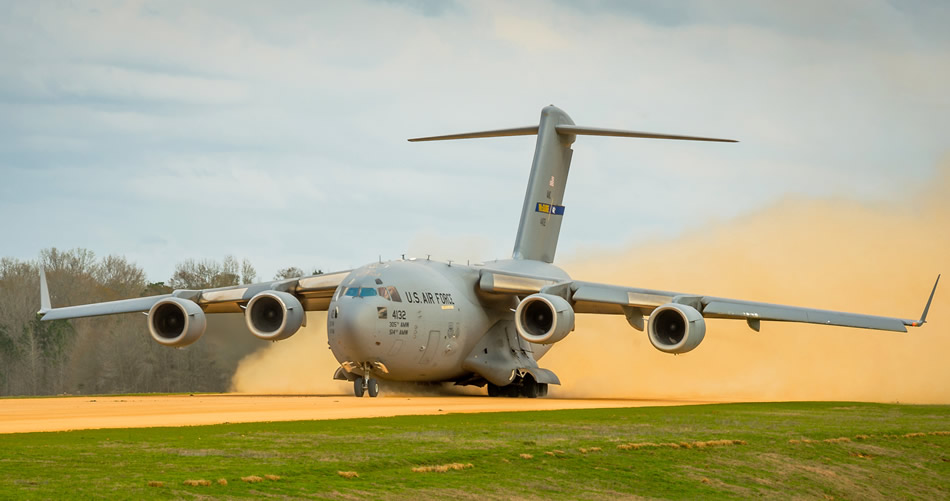 A C-17 Globemaster III takes off March 14, 2014, from the Geronimo landing zone at Joint Readiness Training Center, Fort Polk, La. Service members participating in JRTC 14-05 are educated in combat patient care and aeromedical evacuation in a simulated combat environment. (U.S. Air Force photo/Master Sgt. John R. Nimmo Sr.)