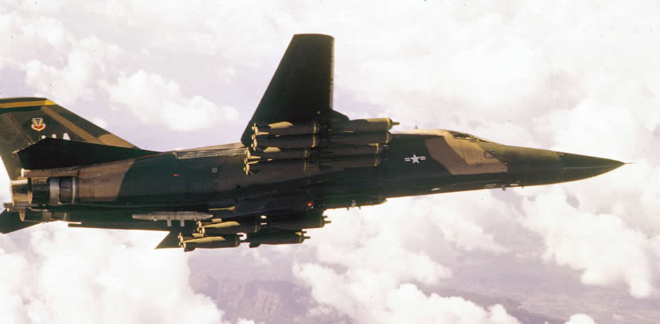 F-111A with a full load of 16 800-pound cluster bombs. The versatile "swing wing" F-111, unofficially named the "Aardvark" until its retirement ceremony on July 27, 1996, when the name was made official, entered the USAF inventory in 1967. The F-111 could exceed twice the speed of sound (Mach 2) by sweeping its wings rearward while in flight. The wings are swept forward for takeoffs, landings or slow speed flight.