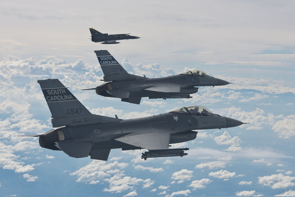 U.S. Air Force F-16 Fighting Falcon aircraft attached to the 169th Fighter Wing, South Carolina Air National Guard fly alongside Colombian Air Force Kfir aircraft attached to the 111th Combat Squadron during Relampago 2014 over Rionegro, Colombia, Aug. 12, 2014. Relampago is an aerial exercise designed to strengthen ties between the U.S. Air Force and the Colombian Air Force. (DoD photo by Maj. Matthew Booth, U.S. Air National Guard)