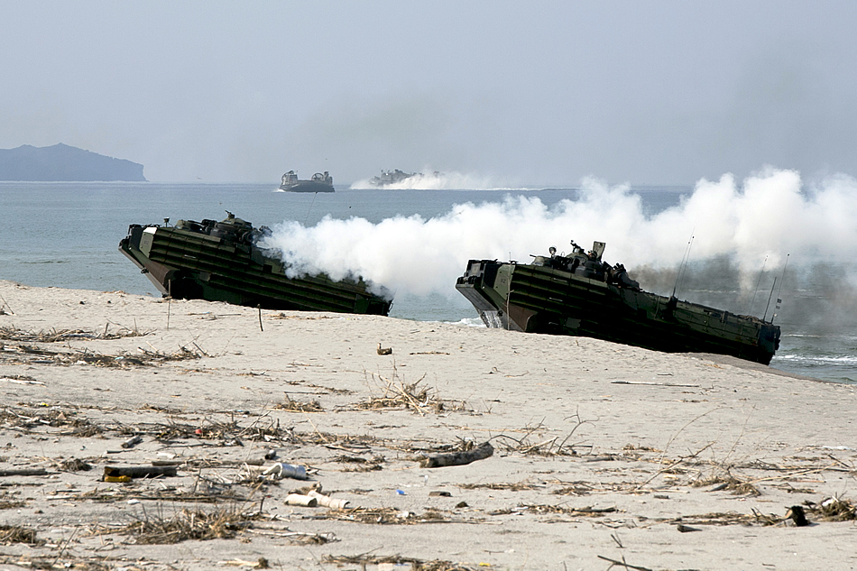 U.S. Marines with India Company, 3rd Battalion, 5th Marine Regiment, 31st Marine Expeditionary Unit and Philippine marines arrive at a beach during a mechanized assault as part of Amphibious Landing Exercise (PHIBLEX) 15 in Zambales, Luzon, Philippines, Oct. 5, 2014. PHIBLEX is a bilateral training exercise designed to improve the interoperability, readiness and professional relationships between the U.S. Marine Corps and partner nations. (DoD photo by Staff Sgt. Joseph DiGirolamo, U.S. Marine Corps)