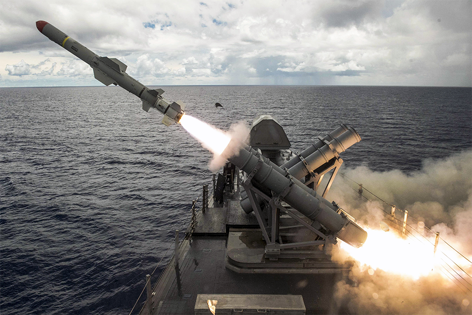 A harpoon missile launches from the missile deck of the USS Coronado off the coast of Guam, Aug. 22, 2017, while the littoral combat ship is on a rotational deployment in U.S. 7th Fleet area of responsibility. Navy photo by Petty Officer 2nd Class Kaleb R. Staples